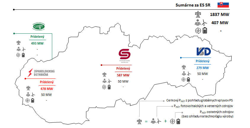 Z pohľadu priepustnosti ES SR je možné do sústavy pripojiť celkový voľný inštalovaný výkon zdrojov o hodnote 1837 MW. Regionalita, resp. miesta pripojenia zdrojov v RDS, majú nezanedbateľný vplyv na bezpečnosť prevádzky ES SR najmä z pohľadu úzkych miest v PS SR. Na základe uvedeného je celkový voľný inštalovaný výkon z pohľadu priepustnosti rozdelený na jednotlivých prevádzkovateľov RDS a PS (graficky zobrazené na obrázku).